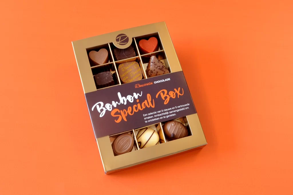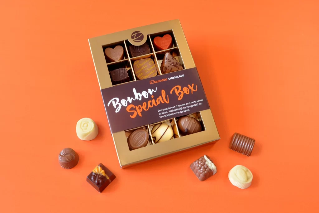 De Bonbon Special Box van Rousseau Chocolade is een tijdelijke actie waarin je een unieke selectie van bonbons kunt ontdekken. Deze box bevat zowel vertrouwde smaken uit ons assortiment als exclusieve nieuwe limited edition bonbons.